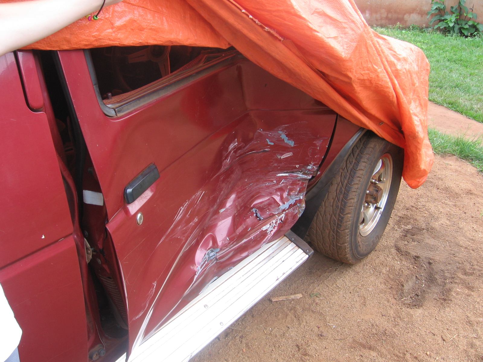 Direct hit to our friend’s door on the driver’s side. Remember driver’s side of the car is on the right in Uganda.